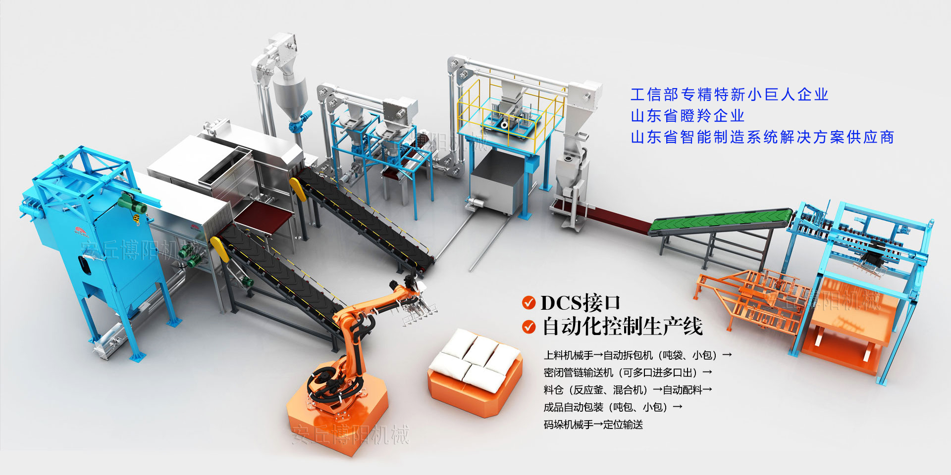 噸袋拆包機(jī)+自動(dòng)拆包機(jī)+智能拆包機(jī)+拆包機(jī)器人→管鏈輸送機(jī)→反應(yīng)釜投料機(jī)器人+料倉(cāng)