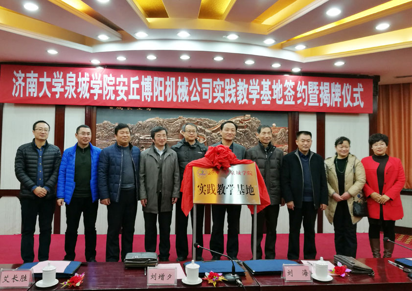 2016年12月30日,濟(jì)南大學(xué)泉城學(xué)院與安丘博陽機(jī)械公司實(shí)踐教學(xué)基地掛牌儀式隆重舉行。泉城學(xué)院劉增夕副院長(zhǎng)、安丘博陽機(jī)械閆吉祥總經(jīng)理、