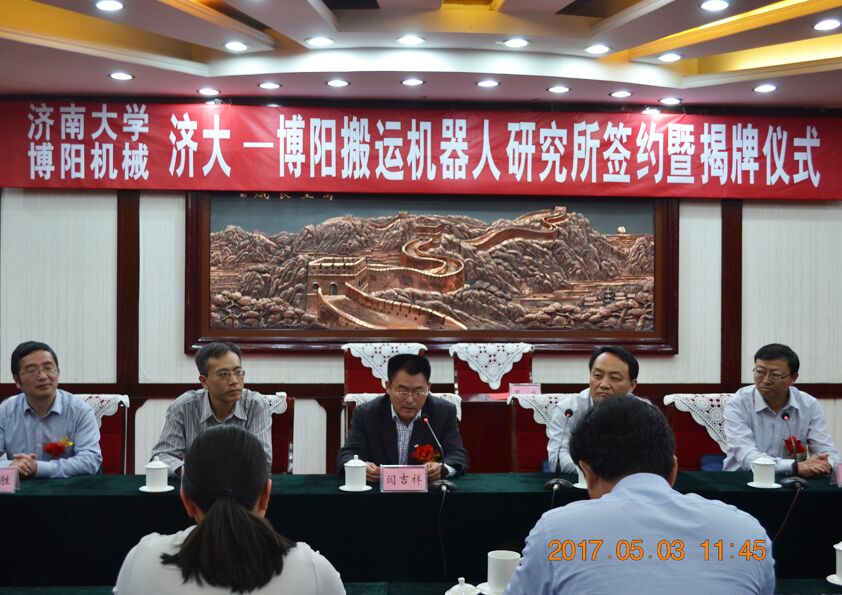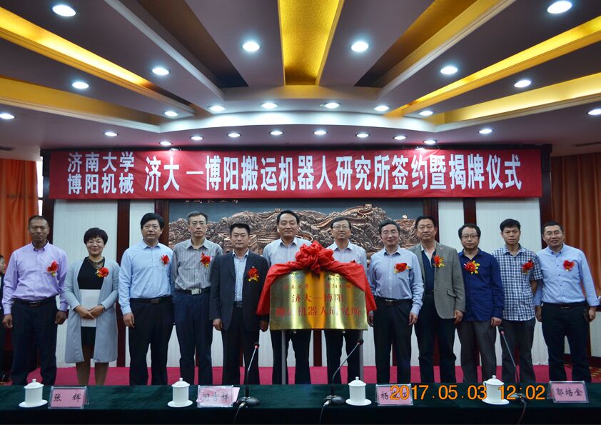 2017年5月3日,濟南大學(xué)與安丘博陽機械制造有限公司聯(lián)合成立的濟大—博陽搬運機器人研究所簽約暨揭牌儀式于安丘市招待所會議廳隆重召開