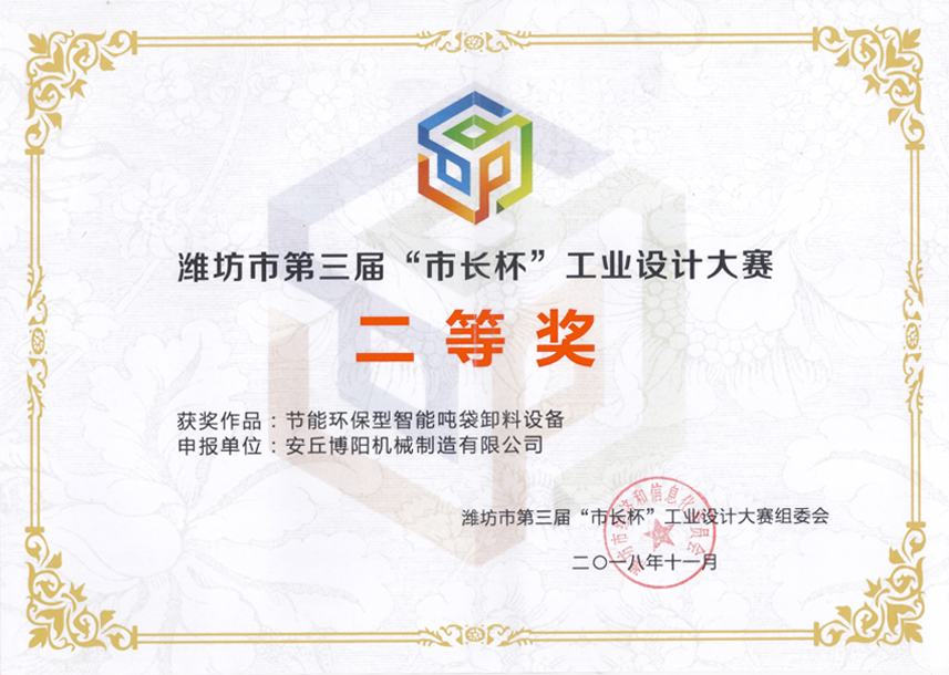本屆“市長(zhǎng)杯”工業(yè)設(shè)計(jì)大賽自啟動(dòng)以來,共收到參賽作品197件,經(jīng)過專家組評(píng)審,共評(píng)選出獲獎(jiǎng)作品40件。本屆大賽的頒獎(jiǎng)儀式于2018年12月25日隆重舉行,安丘博陽機(jī)械制造有限公司的設(shè)計(jì)作品《節(jié)能環(huán)保型智能噸袋卸料設(shè)備》榮獲二等獎(jiǎng)。