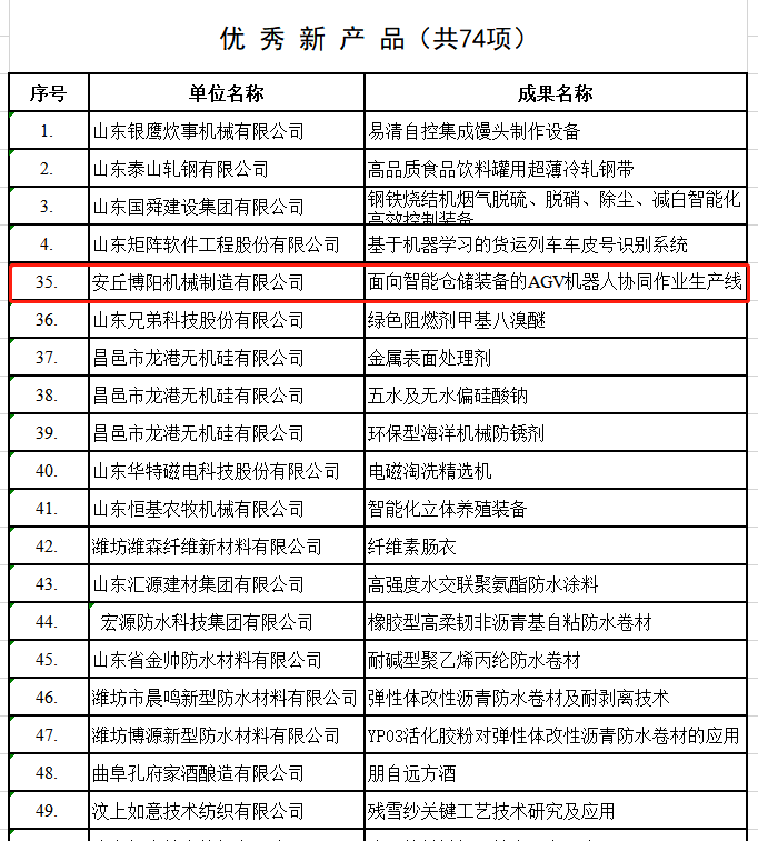 根據(jù)《山東省企業(yè)技術(shù)創(chuàng)新獎(jiǎng)審定管理辦法》和有關(guān)評(píng)審細(xì)則,由山東省企業(yè)技術(shù)創(chuàng)新促進(jìn)會(huì)和山東省中小企業(yè)發(fā)展促進(jìn)中心聯(lián)合組織的2019年度技術(shù)創(chuàng)新youxiu成果、youxiu新產(chǎn)品、youxiu論文評(píng)選活動(dòng)已結(jié)束,安丘博陽(yáng)機(jī)械的面向智能倉(cāng)儲(chǔ)裝備的AGV機(jī)器人協(xié)同作業(yè)系統(tǒng)和面向智能倉(cāng)儲(chǔ)裝備的AGV機(jī)器人協(xié)同作業(yè)生產(chǎn)線分別榮獲2019年度山東省企業(yè)技術(shù)創(chuàng)新“youxiu成果一等獎(jiǎng)”和“youxiu新產(chǎn)品一等獎(jiǎng)”!??!