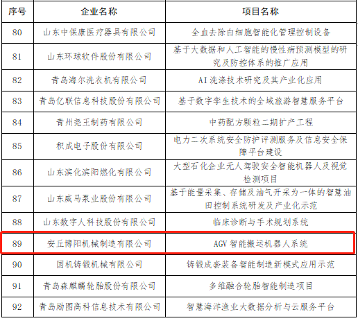 為貫徹落實(shí)省委省政府關(guān)于推進(jìn)“現(xiàn)代優(yōu)勢產(chǎn)業(yè)集群+人工智能”的工作部署,省工信廳組織開展了第二批“現(xiàn)代優(yōu)勢產(chǎn)業(yè)集群+人工智能”試點(diǎn)示范企業(yè)及項(xiàng)目的征集遴選工作,經(jīng)企業(yè)申報(bào)、十強(qiáng)產(chǎn)業(yè)專班及各市工信局、有關(guān)行業(yè)協(xié)會等推薦、專家評審,評選了221個(gè)試點(diǎn)示范企業(yè)和項(xiàng)目。安丘博陽機(jī)械的“AGV智能搬運(yùn)機(jī)器人系統(tǒng)”項(xiàng)目成功入選。