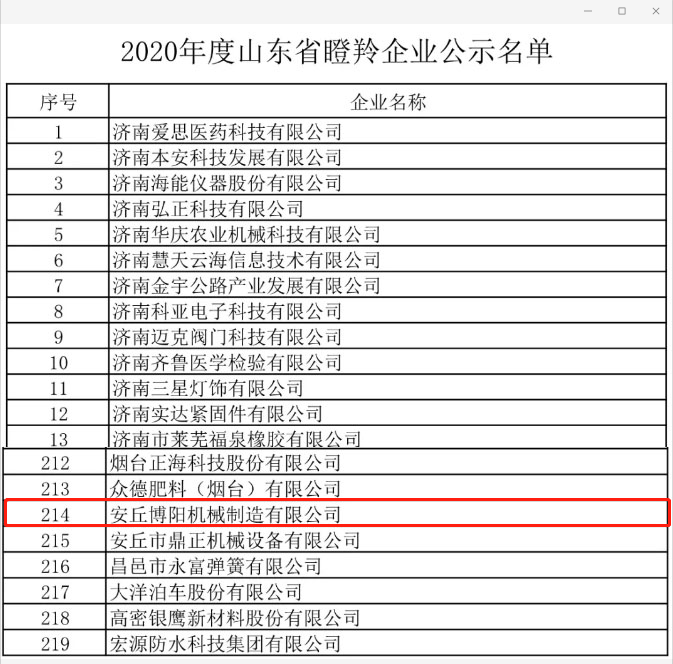 根據(jù)《山東省瞪羚、獨(dú)角獸企業(yè)認(rèn)定管理辦法》(魯工信發(fā)〔2020〕8號(hào))、《關(guān)于組織申報(bào)2020年度山東省瞪羚、獨(dú)角獸企業(yè)的通知》等文件精神,省工業(yè)和信息化廳牽頭組織開展了2020年度瞪羚、獨(dú)角獸企業(yè)評(píng)選工作。經(jīng)企業(yè)自愿申報(bào)、各市中小企業(yè)主管部門推薦、專家評(píng)審、第三方信用評(píng)級(jí)、盡職調(diào)查、聯(lián)合終審等程序,安丘博陽機(jī)械被評(píng)為2020年度山東省瞪羚企業(yè),特此祝賀。