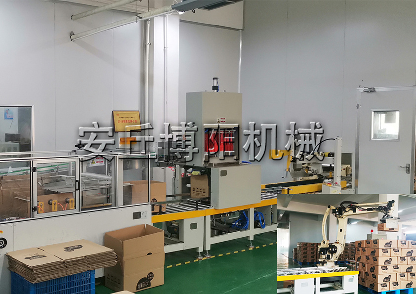 瓶裝產(chǎn)品自動裝箱碼垛線 自動裝箱碼垛機(jī)器人現(xiàn)場