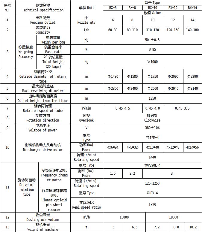 BX型回轉(zhuǎn)式水泥包裝機(jī)采用變頻調(diào)速的主傳動(dòng)系統(tǒng),偏心入料的回轉(zhuǎn)結(jié)構(gòu),配置有無觸點(diǎn)接近開關(guān),上下料位測(cè)控等機(jī)電自動(dòng)控制及微機(jī)自動(dòng)計(jì)量裝置。在操作過程中,除人工插袋外,其它如水泥袋壓緊、灌裝、計(jì)量閘板啟閉、定點(diǎn)掉袋等均可自動(dòng)連續(xù)完成。并具有不插袋不灌裝,袋重不達(dá)到設(shè)定值不掉袋,袋子意外脫落立刻關(guān)閉閘板停止灌裝等獨(dú)特功能。包裝機(jī)設(shè)計(jì)有六嘴、八嘴、十嘴、十二嘴、十四嘴機(jī)型,根據(jù)用戶需要還可承接特殊類型的包裝機(jī)設(shè)計(jì)改造工作。