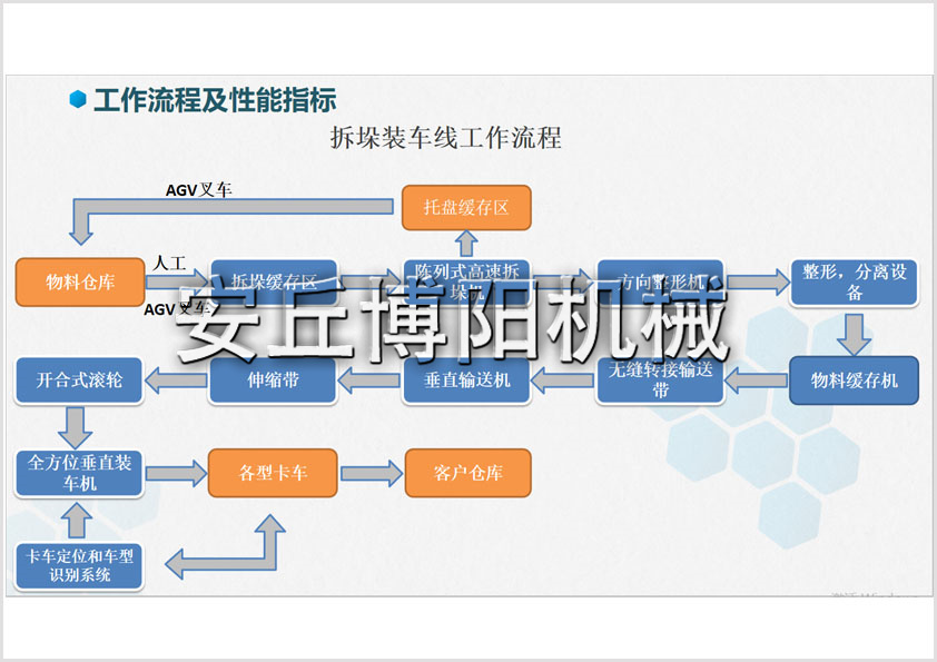 全自動拆垛裝車機用于多種平板車、高欄車等貨運汽車的貨物裝車。能完成袋類包裝物自動拆垛,袋形矯正,自動緩存,對車輛進行智能定位,自動裝車等功能??蓪崿F(xiàn)貨物從智能倉庫到物流的自動化無縫鏈接作業(yè)??筛鶕?jù)客戶需求及不同場地,物料等特性提供特定的完整解決方案。生產(chǎn)線裝車能力可達每小時1200包。